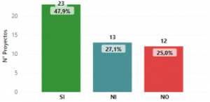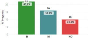 Gráfica 2: Contratación de mano de obra ![]() | Primero: la contratación de mano de obra local Con base en los conocimientos y percepciones de la comunidad, recogidas por los Grupos Motor, se encontró que en 22 de los 48 proyectos se ha contratado mano de obra local, mientras que en 16 no. Para los 10 proyectos restantes esta información no está disponible (NI). |