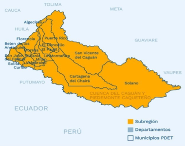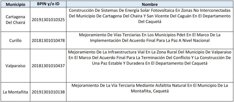 $267,2 | 48 Proyectos en Seguimiento Participativo Albania (3), Algeciras (3), Belén de los Andaquíes (3), Cartagena Del Chairá (3), Curillo (1), El Doncello (3), El Paujil (3), Florencia (3), La Montañita (2), Milán (3), Morelia (3), Puerto Rico (3), San José Del Fragua (3), San Vicente Del Caguán (3), Solano (3), Solita (3) y Valparaíso (3) 78 iniciativas PDET asociadas |