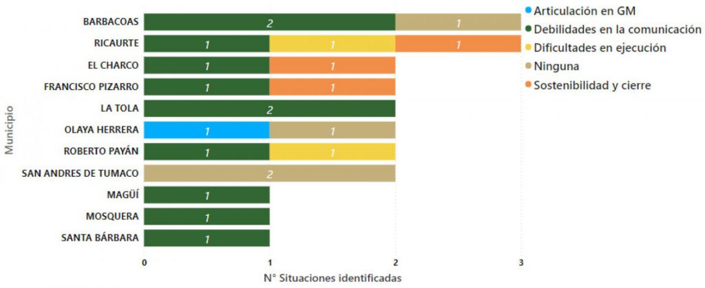 ![]() Las 17 situaciones identificadas fueron reagrupadas, según sus coincidencias en cuatro categorías, como lo ilustra la Gráfica 7: | Debilidades en la comunicación o participación: se trata de necesidades de información o de restablecimiento de la comunicación entre las administraciones locales y los grupos motor, o la comunidad beneficiaria de los proyectos. Fue la situación priorizada en el 64.7% de los proyectos en seguimiento participativo de la subregión, con un total de once, y que se repite en nueve municipios, es decir el 81.8% de los que participan del proceso. Dificultades en la ejecución de los proyectos: aquí se incluyen situaciones relacionadas con rezagos en la ejecución de la obra, insumos incompletos e inconvenientes con la ejecución del contrato. Para la subregión, esta categoría incluye un proyecto que está suspendido, y otro que ya no cuenta con recursos para completar su ejecución. Sostenibilidad y cierre: se trata de situaciones que se presentan una vez finalizados los proyectos y que pueden afectar su funcionamiento y/o mantenimiento. Para la subregión se incluye una mención a un proyecto que ha presentado afectaciones a la obra por la ola invernal. Articulación grupo motor: agrupa las distintas situaciones que afectan la continuidad y permanencia de los integrantes del grupo motor, o el flujo de información al interior del mismo, y que requieren de una mediación para su resolución. Para Pacífico y Frontera Nariñense, la situación se presentó en un proyecto en el municipio de Olaya Herrera. |