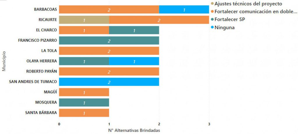 En ocho de las 13 situaciones se priorizó el fortalecimiento de la “comunicación en doble vía”, es decir de fortalecer los canales de comunicación entre alcaldía, la población local y el grupo motor. Asimismo, en un caso se subrayó el fortalecimiento de la participación de los Grupos Motor en un proyecto que requería ajustes técnicos en la focalización de los beneficiarios. También se hizo una mención a convocar a los entes de control.