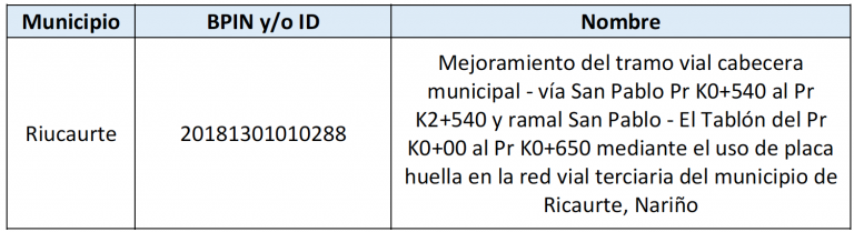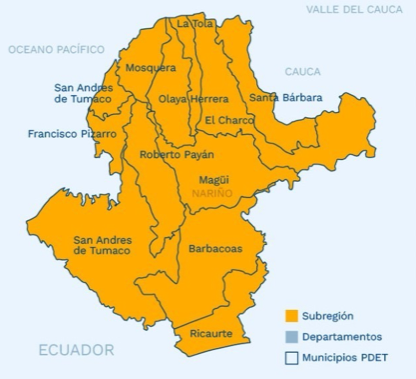 $110,45 | 21 Proyectos en Seguimiento Participativo Barbacoas (3), La Tola (2), San Andrés de Tumaco (2), Olaya Herrera (2), Ricaurte (3), Roberto Payán (2), Magüí (1), El Charco (2), Santa Bárbara (1), Mosquera (1), Francisco Pizarro (2) 17 iniciativas PDET asociadas |