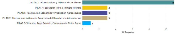 Los proyectos en seguimiento participativo para el primer semestre de 2021 se distribuyen por tipos de productos de la siguiente manera: soluciones energéticas (7), proyectos productivos (6), vías terciarias (4), dotaciones didácticas o ambientes educativos (3) y unidades sanitarias (1).