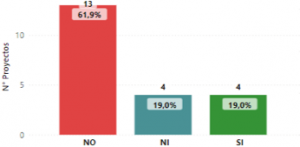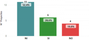 Gráfica 2: Contratación de mano de obra ![]() | Primero: la contratación de mano de obra local Con base en los conocimientos y percepciones recogidas por los GM, se encontró que en 11 proyectos se contrata mano de obra local, mientras que en 4 no. No hay Información (NI) para 6 proyectos de los cuales 3 están en contratación. |