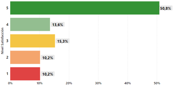 El nivel de satisfacción de la comunidad para este proyecto fue alto en relación con el logro del objetivo y la mejora de las condiciones de vida de la comunidad, y muy alto frente a los resultados obtenidos y la calidad de los bienes entregados, como se observa en la gráfica siguiente. En la actualidad, la vía ha presentado cierres temporales por deslizamientos ocasionados por la ola invernal.