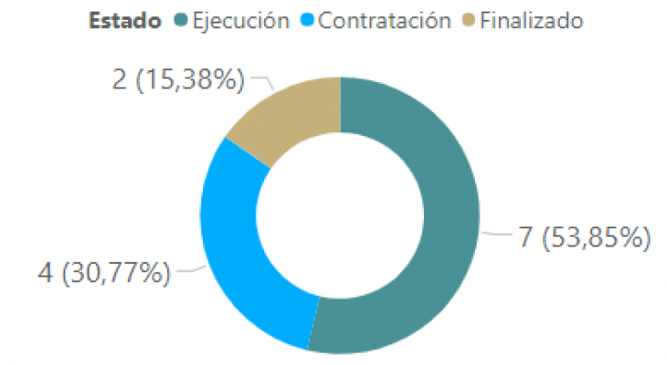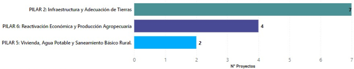 Las gráficas siguientes ilustran los pilares de los que hacen parte los 13 proyectos en seguimiento participativo de la subregión, y el estado en el que se encuentran en el ciclo de proyectos, es decir, si están: contratados, en ejecución, finalizados o suspendidos.