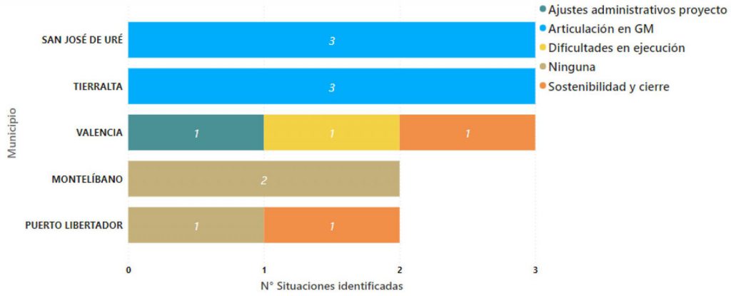 ![]() Las 11 situaciones identificadas fueron reagrupadas, según sus coincidencias en cuatro categorías, como lo ilustra la Gráfica 7: | Articulación en el grupo motor: agrupa las distintas situaciones que afectan la continuidad y permanencia de los integrantes del grupo motor, o el flujo de información al interior del mismo, y que requieren de una mediación para su resolución. Esta situación afectó el desarrollo satisfactorio de la fase 2 del seguimiento participativo en los seis proyectos de Tierralta y San José de Uré, siendo la situación más veces priorizada en la subregión. Sostenibilidad y cierre: se trata de situaciones que se presentan una vez finalizados los proyectos y que pueden afectar su funcionamiento y/o mantenimiento. Para este reporte en la Subregión Sur de Córdoba esta situación se presentó en dos proyectos en los municipios de Valencia y Puerto Libertador. Dificultades en la ejecución de los proyectos: aquí se incluyen todas las situaciones que afectan la ejecución de la obra, esto incluye, dificultades que generan sobrecostos, ajustes en la focalización de los beneficiarios, la ubicación del proyecto, daños generados a los productos por inconvenientes de mantenimiento y sostenibilidad de las obras. Para este reporte se presentó una situación en Valencia relacionada con la desvinculación de familias beneficiarias al proyecto. Ajustes administrativos del proyecto: Situaciones relacionadas con procesos de contratación, o reporte de información en los aplicativos respectivos. Para este reporte esta situación se presentó únicamente en un proyecto en el municipio de Valencia. |