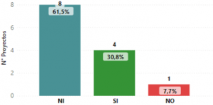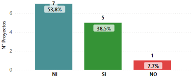 Gráfica 2: Vinculación de mano de obra local ![]() | Primero: la contratación de mano de obra local Con base en los conocimientos y percepciones recogidas por los GM, en 6 proyectos se contrata mano de obra local, mientras que para los otros 7 No hay Información (NI). |