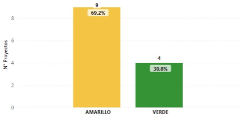 | Con base en sus percepciones y conocimientos, el Grupo Motor (GM) identifica las situaciones que pueden afectar el buen desarrollo de los proyectos. Estas situaciones, a su vez, son semaforizadas según el sentir de las comunidades para establecer el nivel de prioridad para ser tramitadas, de esta manera, los criterios con los que se asigna cada color dependerán de cada contexto. Para la subregión de Sur de Córdoba se identificaron 11 situaciones, de ellas, a nueve situaciones se les asignó el color amarillo, lo que significa que son de urgencia media, y a dos se les asignó una urgencia de nivel bajo por lo que se semaforizó con el color verde. A dos proyectos más no se le identificó situación alguna por lo que se identificaron también con el color verde (Gráfica 6). | Gráfica 6: Semaforización de situaciones identificadas ![]() |