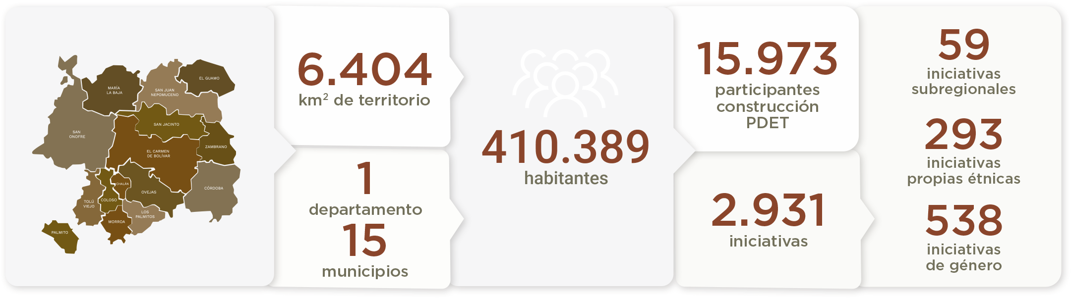 Municipios: Bolívar: Córdoba • El Carmen de Bolívar • El Guamo • María La Baja • San Jacinto • San Juan Nepomuceno • Zambrano. Sucre: Chalán • Colosó • Los Palmitos • Morroa • Ovejas • Palmito • San Onofre • Tolú Viejo.
