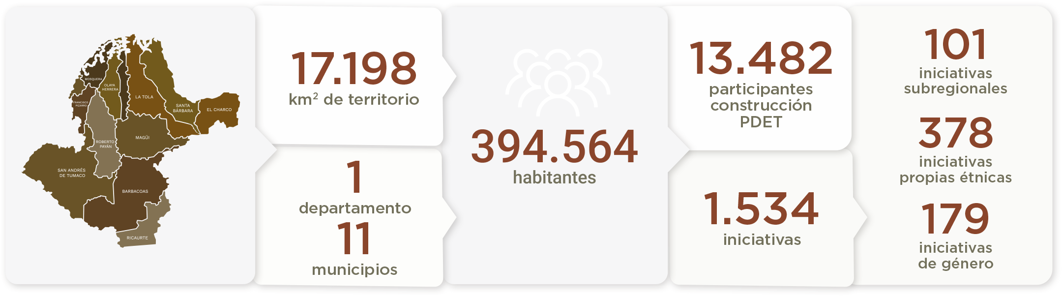 En esta subregión conviven culturas diversas, en su mayoría afro e indígena, que se dedican a la pesca artesanal, derivada de la riqueza que guarda el manglar, uno de los ecosistemas predominantes en la costa del Océano Pacífico. en su rica geografía también hay valles aluviales de potentes ríos como el Mira, o el Patía, donde se ha desarrollado la agricultura de frutos tropicales y la ganadería; y tiene bosques de niebla y cientos de quebradas, esto a causa de que, como todo el Chocó biogeográfico, los niveles de lluvia son de los más altos a nivel mundial. Hay que destacar el puerto de Tumaco, el segundo en importancia de pacífico colombiano, y donde habita la mayoría de la población.