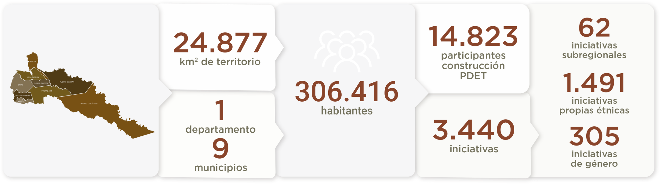 Municipios: Mocoa • Orito • Puerto Asís • Puerto Caicedo • Puerto Guzmán • Puerto Leguízamo • San Miguel • Valle del Guamuez • Villagarzón