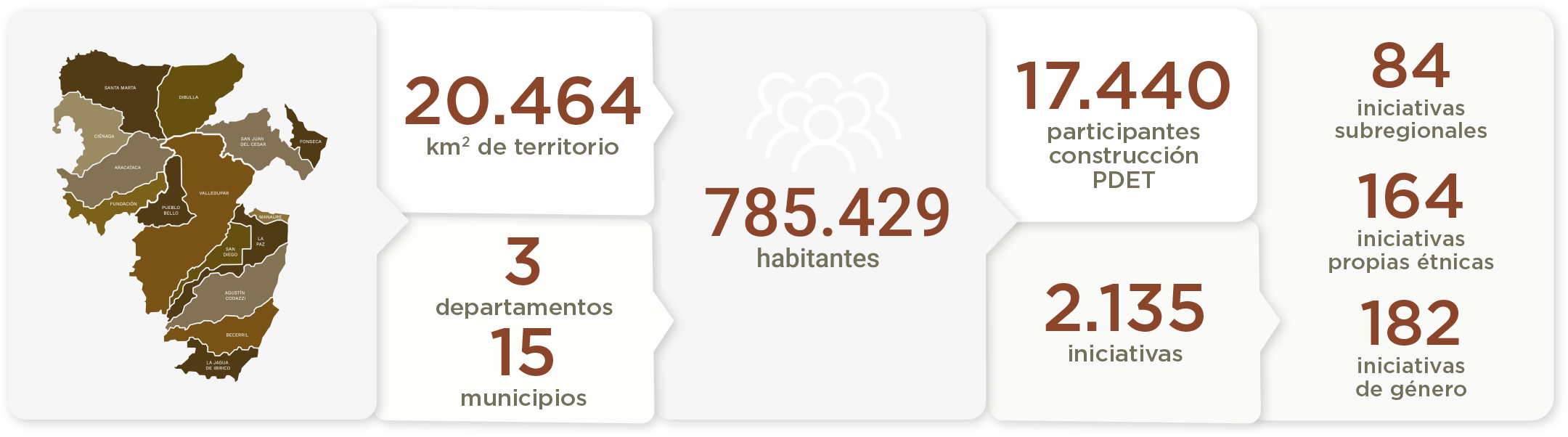 Municipios: Cesar: Agustín Codazzi • Becerril • Jagua de Ibirico • La Paz • Manaure • Pueblo Bello • San Diego • Valledupar. La Guajira: Dibulla • Fonseca • San Juan del Cesar. Magdalena: Aracataca • Ciénaga • Fundación • Santa Marta.