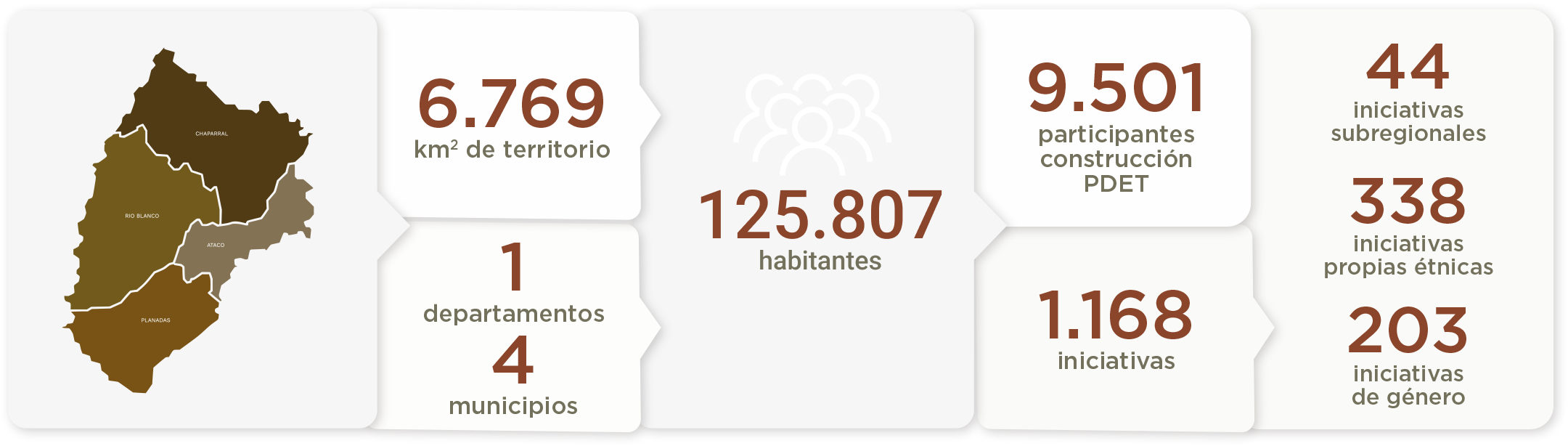 La subregión pdet Sur del Tolima es un amplio y biodiverso territorio alojado en la cordillera central que permite la interconexión entre los Llanos Orientales y el Pacífico colombiano. Su extensión territorial es un poco más de 3 veces la de Bogotá, pero su población apenas alcanza el 1,5% de la capitalina, unas 18 personas por kilómetro cuadrado. El 62,5% de la población habita en zona rural dispersa, lo que ha dificultado por años el acceso a servicios públicos y sociales, así como a una mejor infraestructura vial, educativa y de salud, entre otros. El café es el principal renglón de su economía, con una producción anual de más de 200 mil toneladas, seguido del cacao, el plátano, la caña panelera y las actividades pecuarias. El Parque Natural las Hermosas, el Parque Nacional Natural Nevado del Ruiz, La Ruta del Café, y las cuevas y cascadas Tuluní son atractivos turísticos reconocidos de la región, que bien vale la pena visitar.