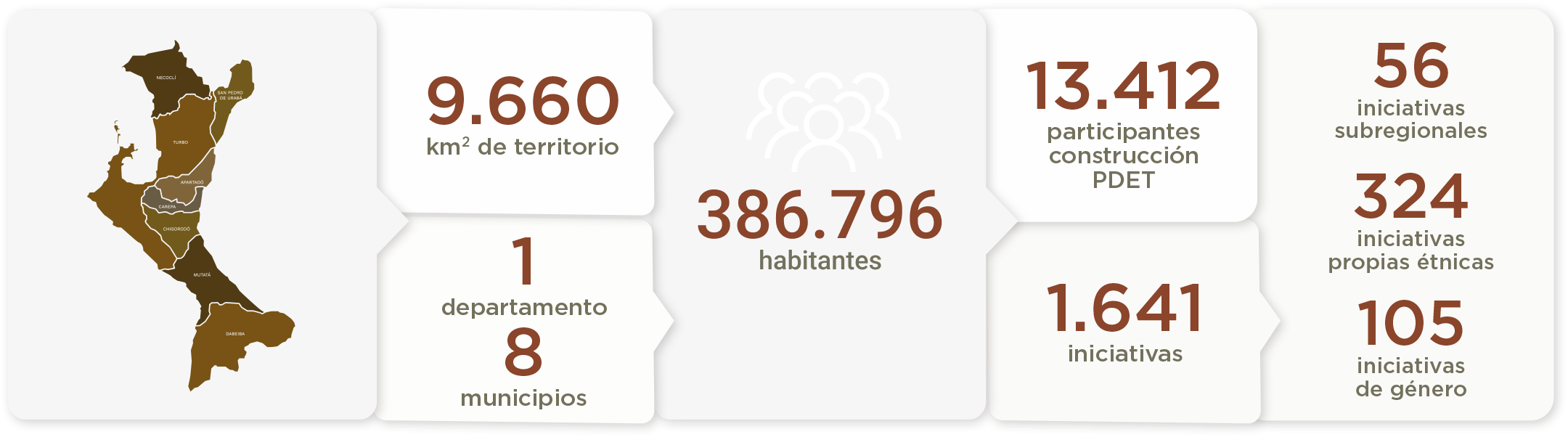Municipios: Antioquia: Apartadó • Carepa • Chigorodó • Dabeiba • Mutatá • Necoclí • San Pedro de Urabá • Turbo
