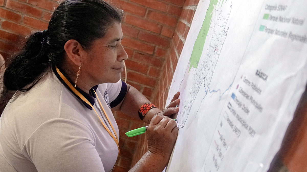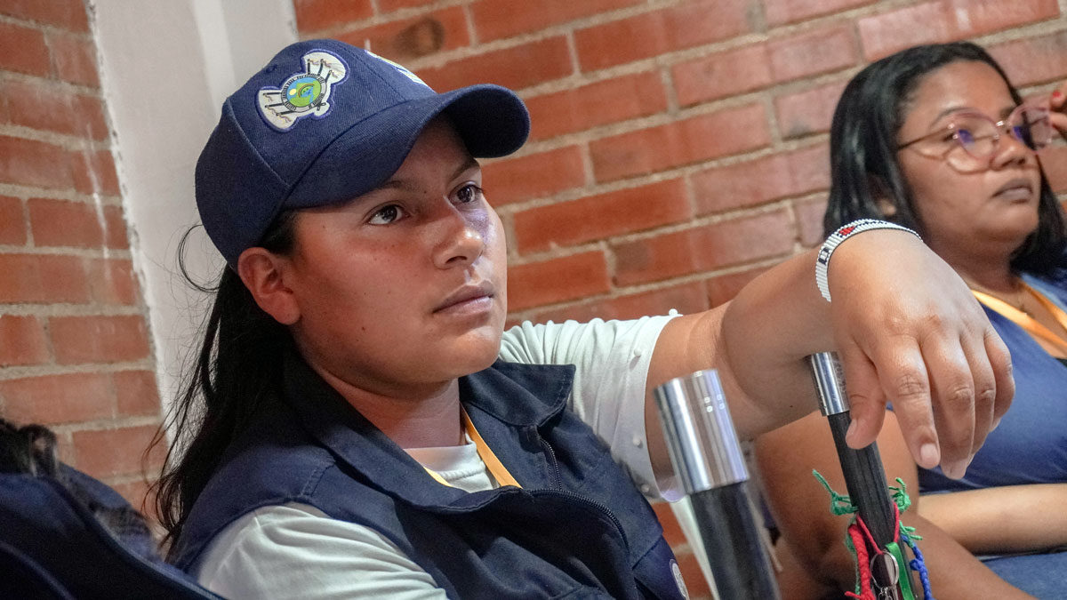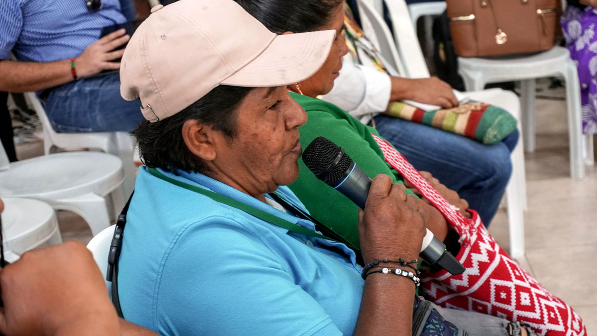 María Alejandra Serquera es la más joven de las asistentes. Tiene una mirada profunda y un bastón de mando del Cabildo Indígena Barbacoa que porta orgullosa, como símbolo de pertenencia y compromiso con su comunidad, no duda en animar a más mujeres a participar activamente de estos procesos: “A otras mujeres yo les diría que participen, es importante. Si nos ponemos la camiseta, salir a aprender. Por ejemplo, yo soy como digamos de estar allá en la casa, nunca había participado en esto hasta ahorita, y a mí me parece que es muy bueno aprender, porque bueno, como dije muchas veces uno o sea se hace como a un lado y pues tal vez eso no es bueno, porque ya el día que a uno le toca, es complicado, entonces sí es bueno ir uno así, saliendo de a poquito, irse preparando luego como irse integrando más en estos temas y luego saber cómo apostarle y aportarle a la paz.”