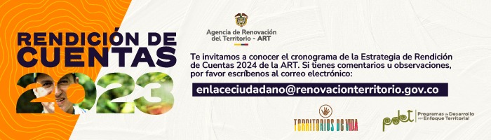 Invitamos a la ciudadanía a conocer el cronograma de la Estrategia de Rendición de Cuentas de la ART. Si tiene comentarios u observaciones por favor escríbalos al siguiente correo: enlaceciudadano@renovacionterritorio.gov.co